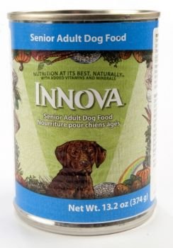 Innova Senior Canned Dog Food 12 Pack Case Innova Senior Canned provides all of the fresh, healthy ingredients of Innova Senior Dry Food, in a can, for older dogs who prefer moist food. After laying the foundation for good health in later years with ingredients from the five basic food groups, Innova Senior also includes Vitamin E, additional natural fiber to aid digestion, and reduced protein and fat to control weight. Innova Senior is the first food in the industry for older dogs that includes the dietary supplements Chondroitin Sulfate and Glucosamine, believed to help rebuild cartilage and ease the pain of osteoarthritis. Geriatric dogs have special needs. Like us, your dog can suffer from age-related problems such as: weaker immune system, less efficient digestive system, reduced nutritional needs and osteoarthritis. Innova Senior is unlike any senior dog food on the market today. Most senior diets just contain less protein and fat with added fiber. Innova Senior goes beyond that in its formulation with the total aging process in mind. Ingredients Turkey, Chicken, Spring Water, Whole Eggs, Ground Brown Rice, Chicken Fat, Potatoes, Herring, Sunflower Oil, Apples, Carrots, Cottage Cheese, Fish Oil, Garlic, Locust Bean Gum, Alfalfa Sprouts, Chondroitin Sulfate, Glucosamine, Vitamins/Minerals. Guaranteed Analysis Guaranteed Analysis describes the nutrient content required by AAFCO labeling standards to be identified on every product package. Since these are guarantees, pet food manufacturers work to formulate diets that meet or exceed the minimum requirements. For more information, read our GA FAQ's. Crude Protein (min) 4.4 %CHAR(13) + CHAR(10) Crude Fat (min) 3.2 % CHAR(13) + CHAR(10) Crude Fiber (max) 3.6 % CHAR(13) + CHAR(10) Moisture (max) 78 % CHAR(13) + CHAR(10) Linoleic Acid (Omega-6 Fatty Acid) (min) 1.1 %CHAR(13) + CHAR(10) Vitamin E (min) 100 IU/kg CHAR(13) + CHAR(10) Vitamin C (min) 330 mg/kg CHAR(13) + CHAR(10) Omega-3 Fatty Acids (min) 0.23 %CHAR(13) + CHAR(10) Glucosamine (min) 89 mg/kg CHAR(1